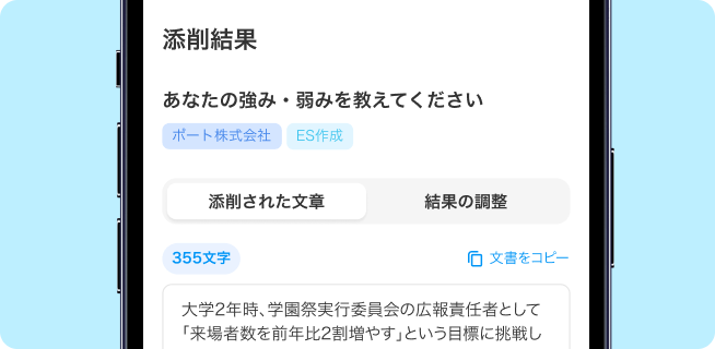 作成・添削された文章は、言い回しや文字量の調整が可能。 最終的に自分で確認して整えられるため、安心して使えます。